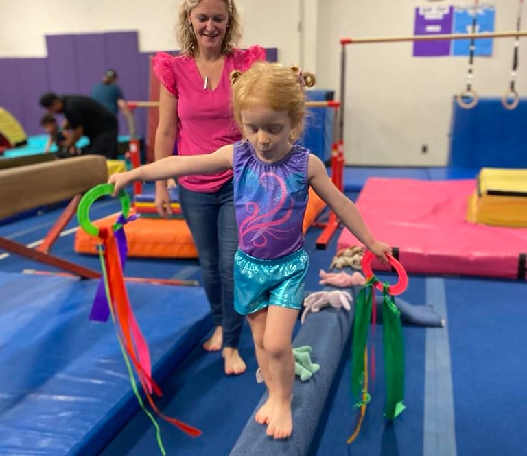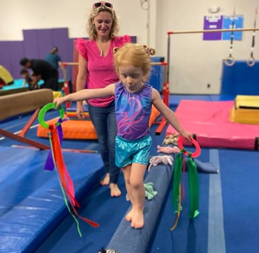 Launch your toddler's development and athleticism with our Super Tots class - where bonding meets movement and fun! This class is packed with engaging developmental exercises and beginning gymnastics skills. Parents will come ready to guide their children as they build gross and fine motor skills, balance, strength, coordination, and listening skills. With your support, your toddler will begin laying the foundation for a strong future in gymnastics and athletics, all while making precious memories together. Join our warm, welcoming community and experience the joy of movement from the very beginning!